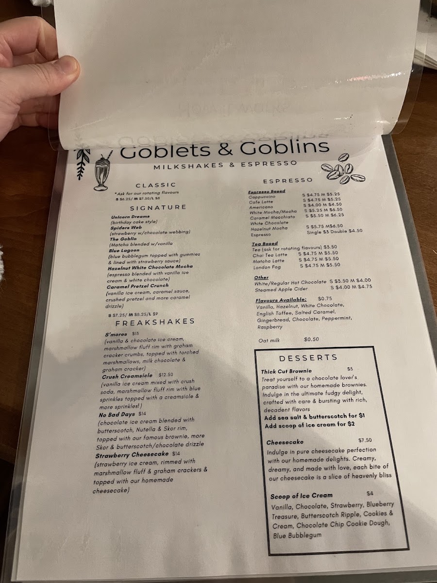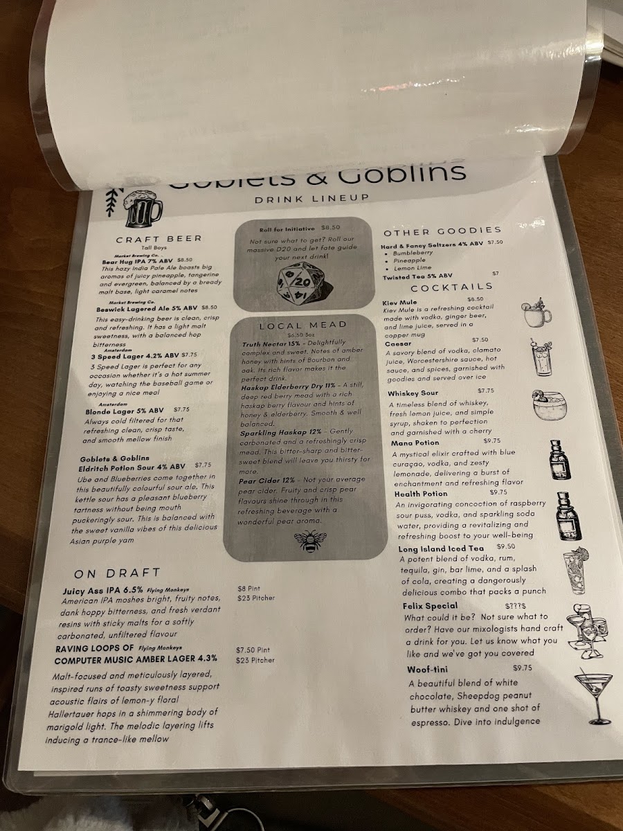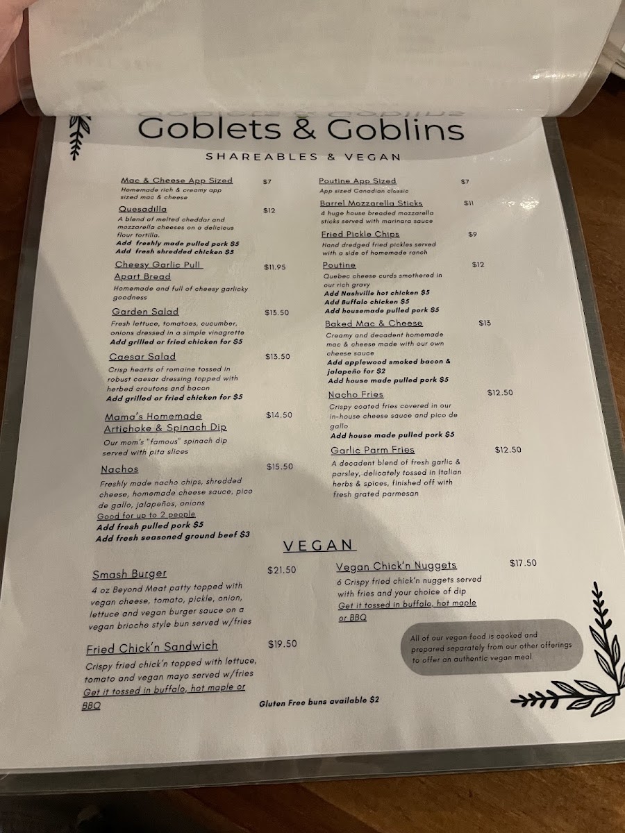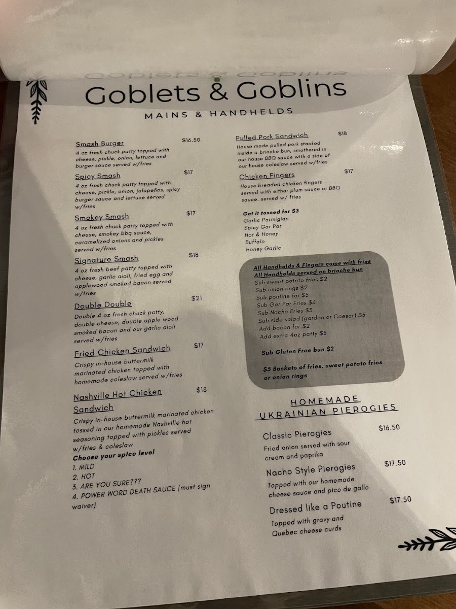 From a reviewer's perspective, the menu at Goblets & Goblins at 17766 Leslie St, Newmarket, is a delightful mix of indulgent comfort food and playful creativity. The Showstoppers section shines with options like the Fried Chicken Sandwich featuring Buffalo, Crispy, or GarPar Chicken, and the Chicken Fingers available as Classic, Garpar, or Buffalo Fingers, all promising hearty, satisfying bites. For sharing, the Shareables such as Veggie Quesadillas, Cheese Quesadillas, Grand Slam Nachos, and assorted baskets like Mama's Spindip, Mozza Sticks, Sweet Potato Fries, and Cheesy Garlic Knots make group dining fun and flavorful. Dessert enthusiasts will find tempting options like Cheesecake Factory, Gluten Free Lava Cake, and the whimsically named Dragon's Hoard Delight. Families with little ones can enjoy the Kids Menu, which includes Kids Mac And Cheese, Kids Chicken Fingers, Kids Poutine, and Kids Smash Burger, offering familiar favorites in kid-friendly portions. The menu also caters to poutine lovers with hearty choices like Buffalo Chicken Poutine, Traditional Poutine, and BBQ Pulled Pork Poutine, while those seeking a more substantial meal can opt for Mains like the Chicken Caesar Wrap, Classic Smash, Spicy Smash Double Double, or Breakfast Wrap. Overall, the menu balances indulgence and variety, making Goblets & Goblins a go-to spot for both adventurous eaters and comfort-food fans alike, with each dish named clearly and evocatively, giving diners a sense of fun before their first bite.